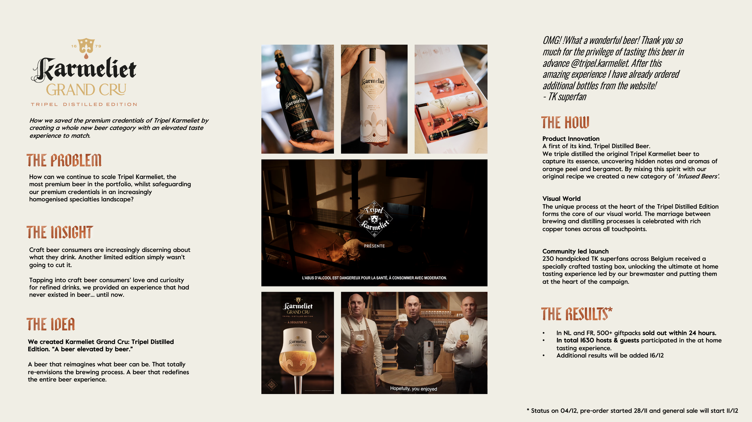 To cement our position as a category defining beer we launched Karmeliet Grand Cru: Tripel Distilled Edition. A first of its kind, Tripel Distilled Beer.